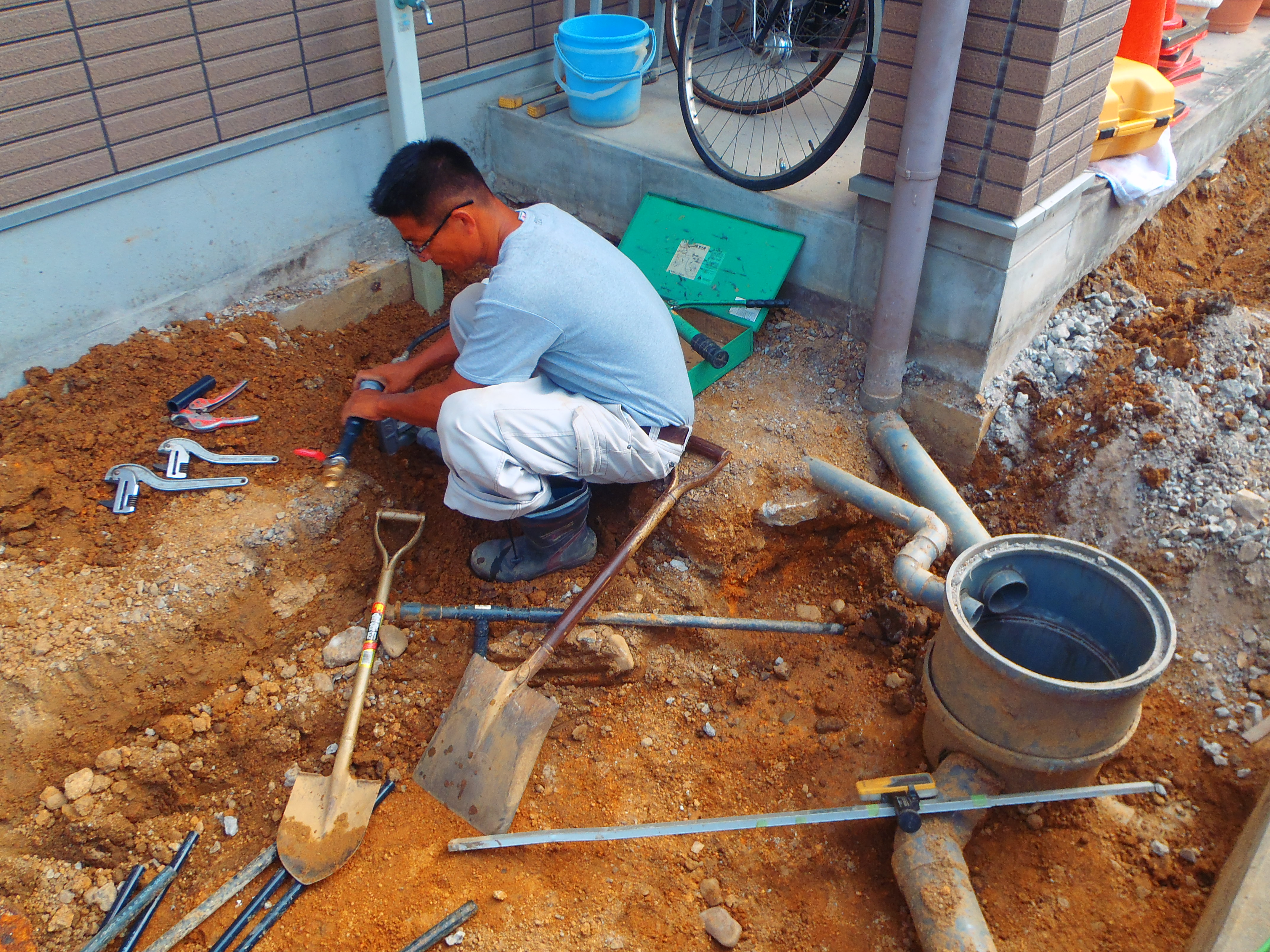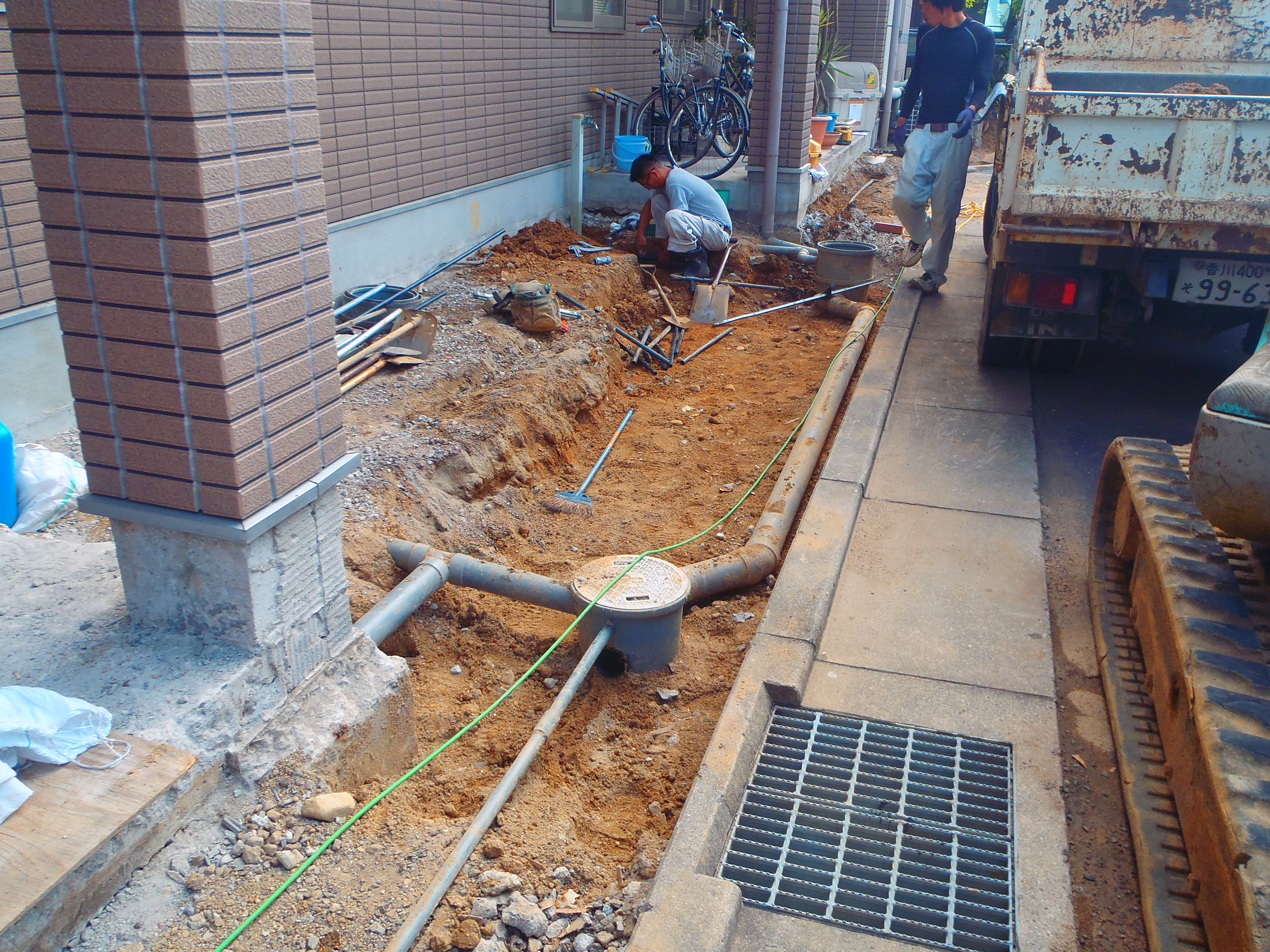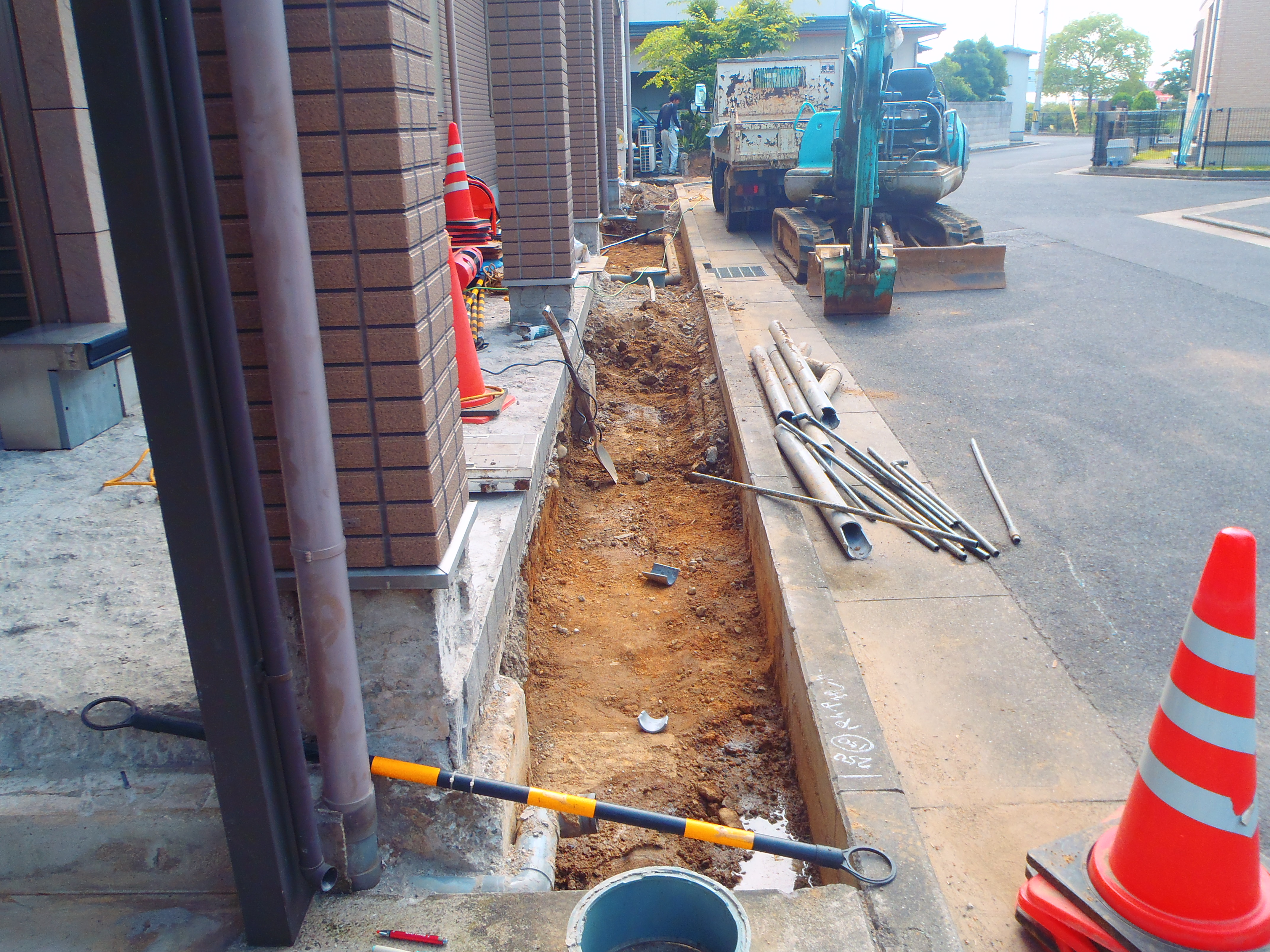 19m間を重機で掘り下げ、古い配管をやり直していきます。