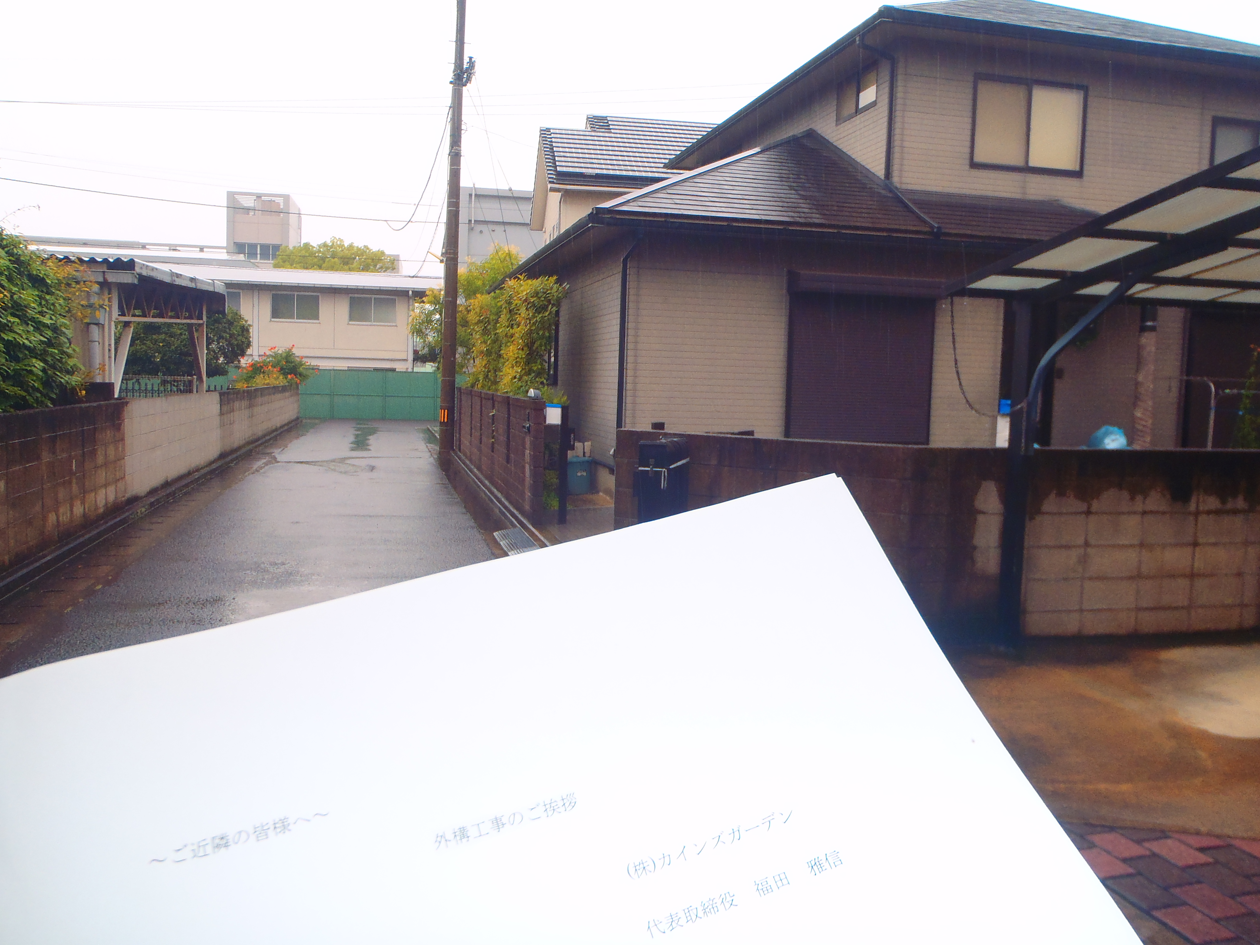 工事前ご挨拶 福田 | 2015年7月7日 今日は朝から大雨でしたー。外構工事はこうゆう雨天時は工事中止となってしまいます。 ですが、まだまだ梅雨が明けなくても明日から掛かる工事がありますので、前もってご近隣にご挨拶に伺ってきました。 Y様明日から宜しくお願い致します! Blog ← 夏だ!海だ!雑草狩りだ!床リフォーム工事かんりょーです♪ →