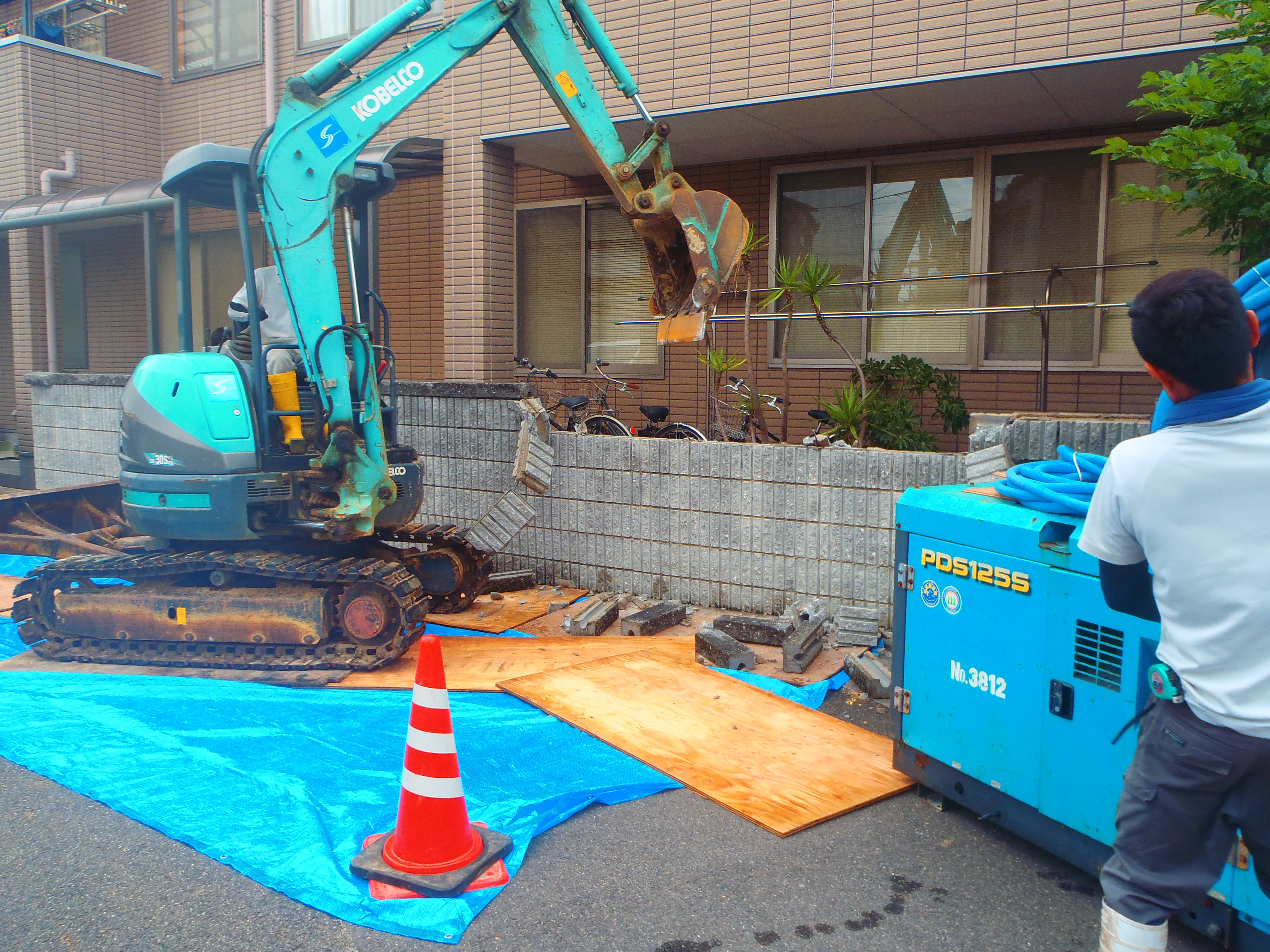 ブロック壁は道路を養生し、ユンボで倒していきます。