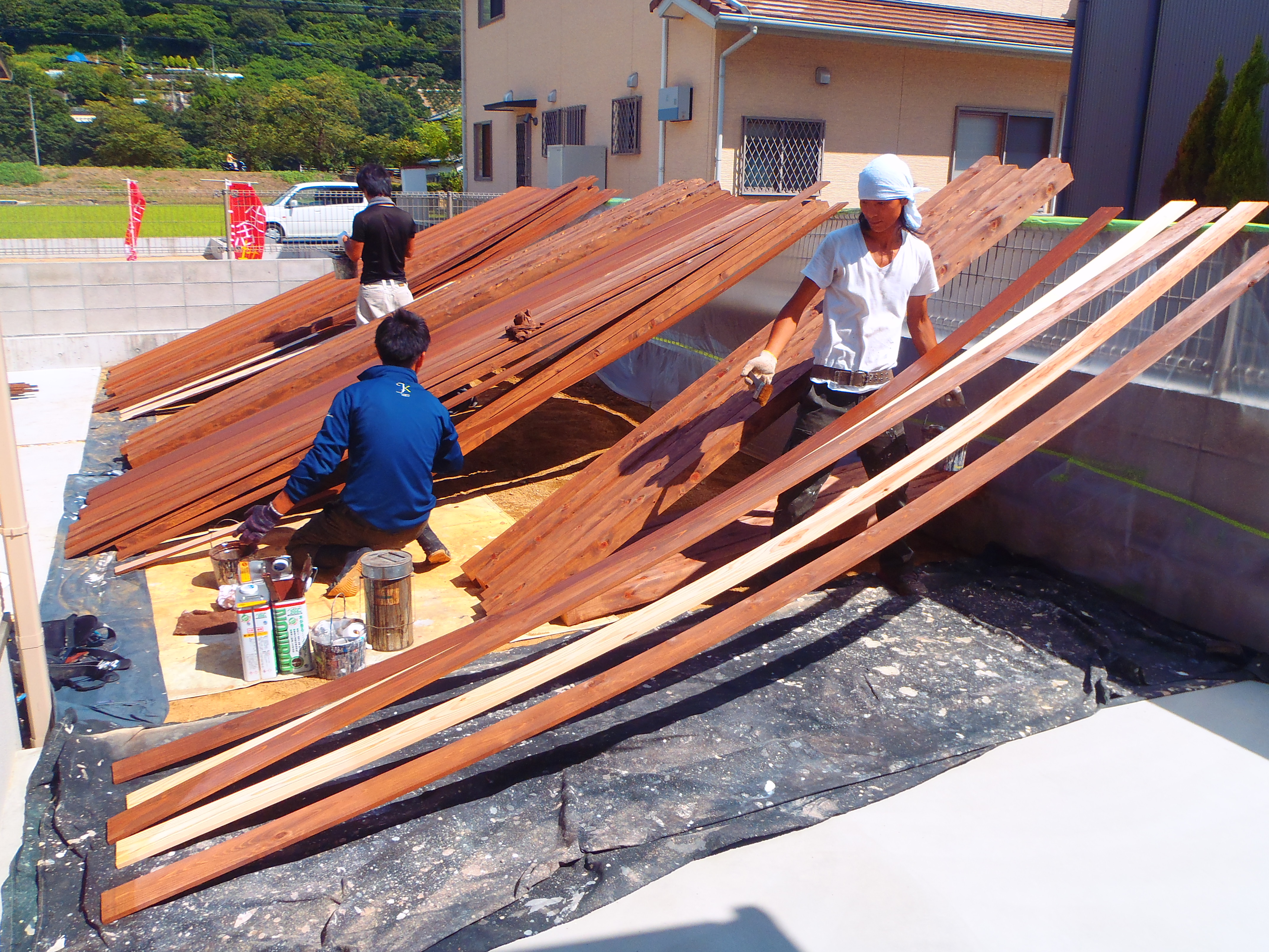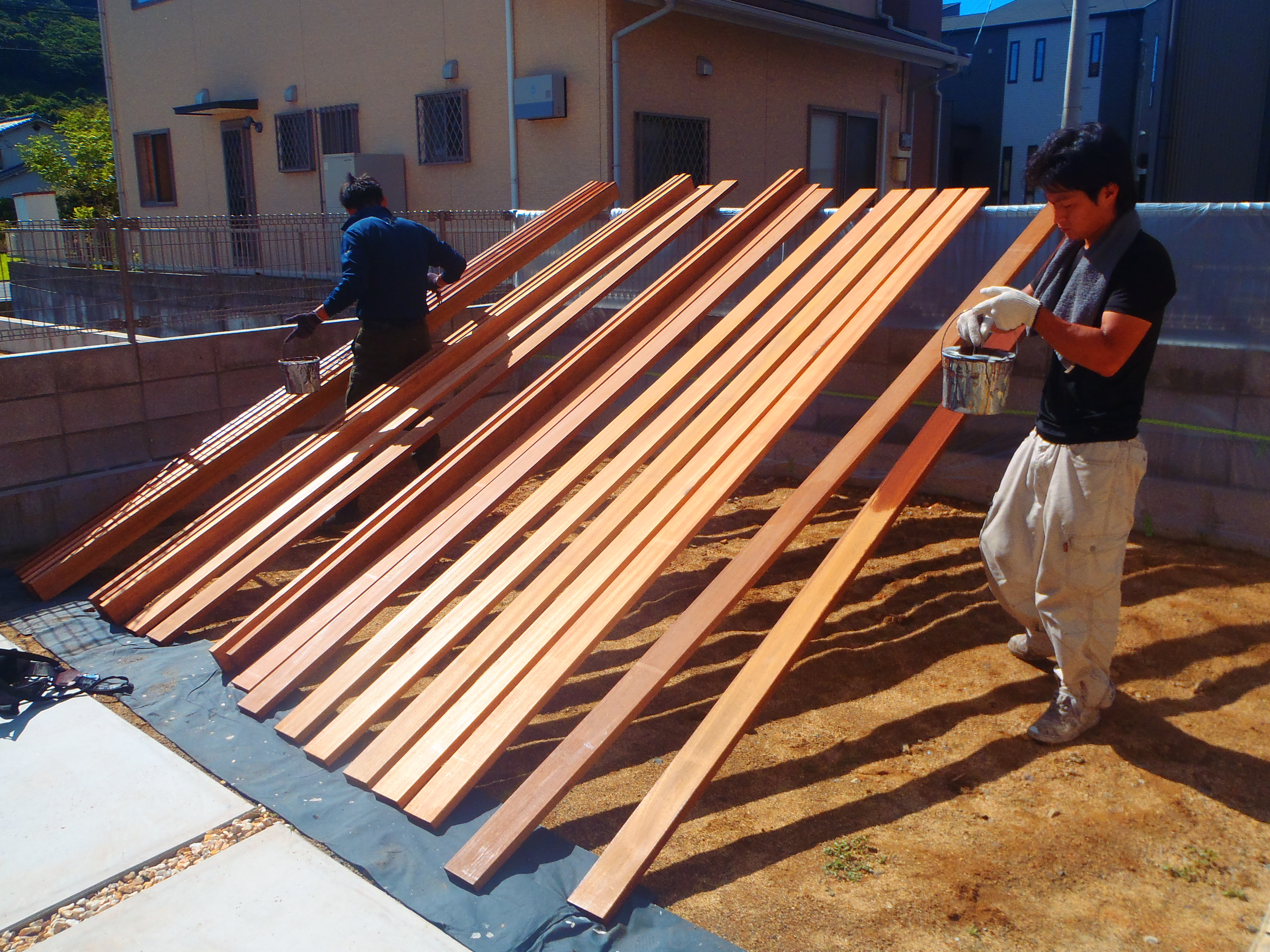 朝から職人さん来てくれて、暑い中日向で塗装