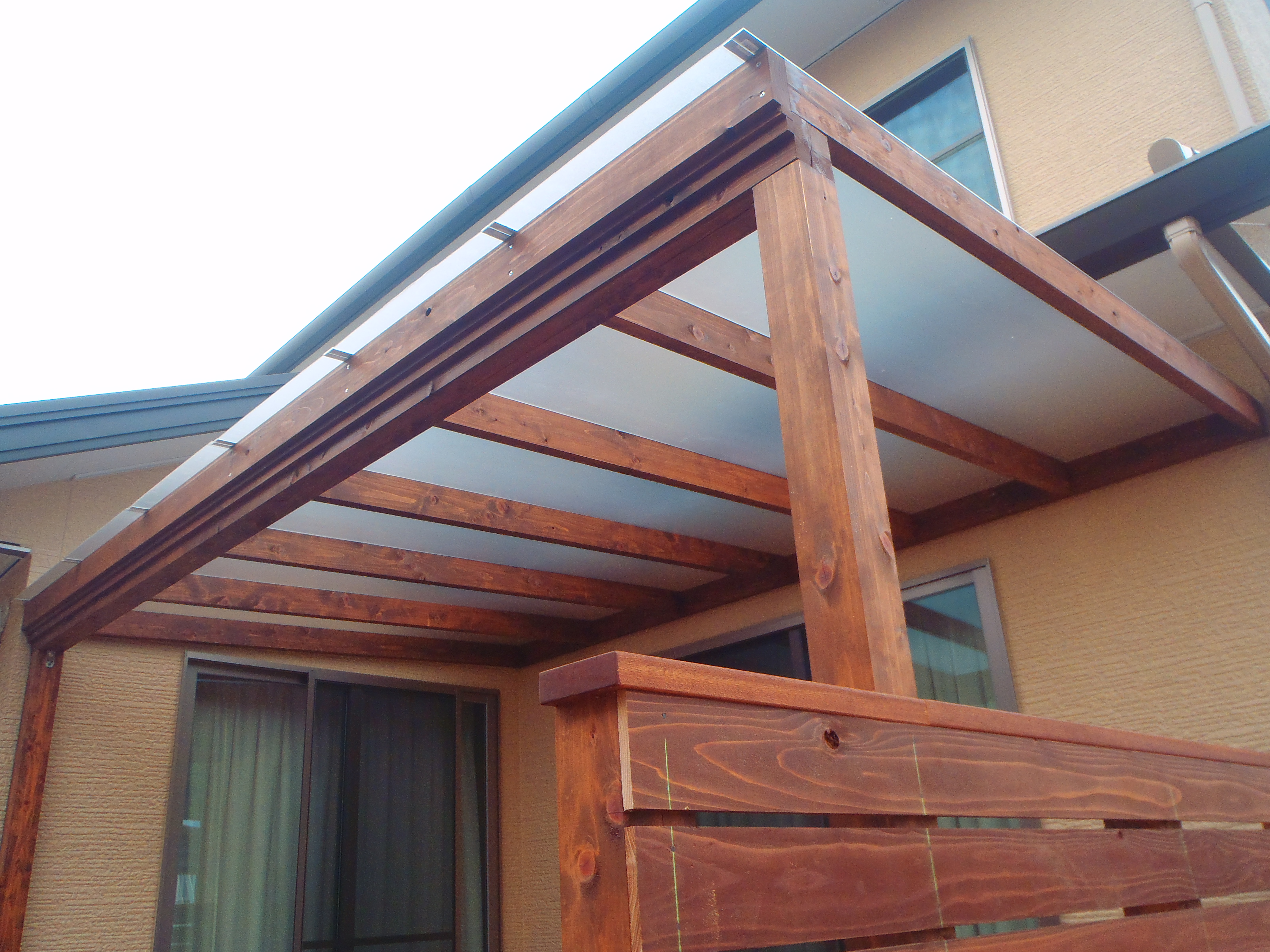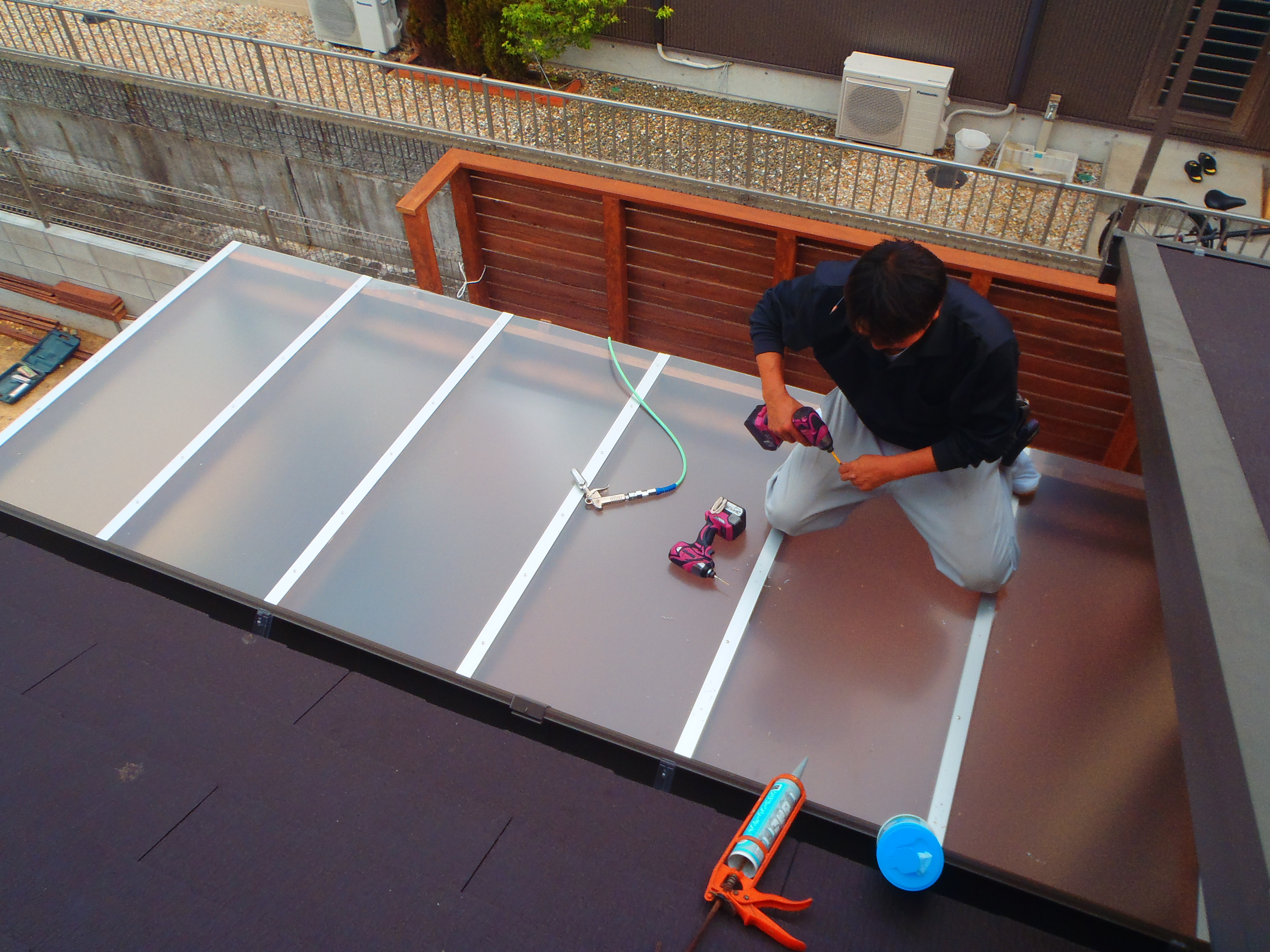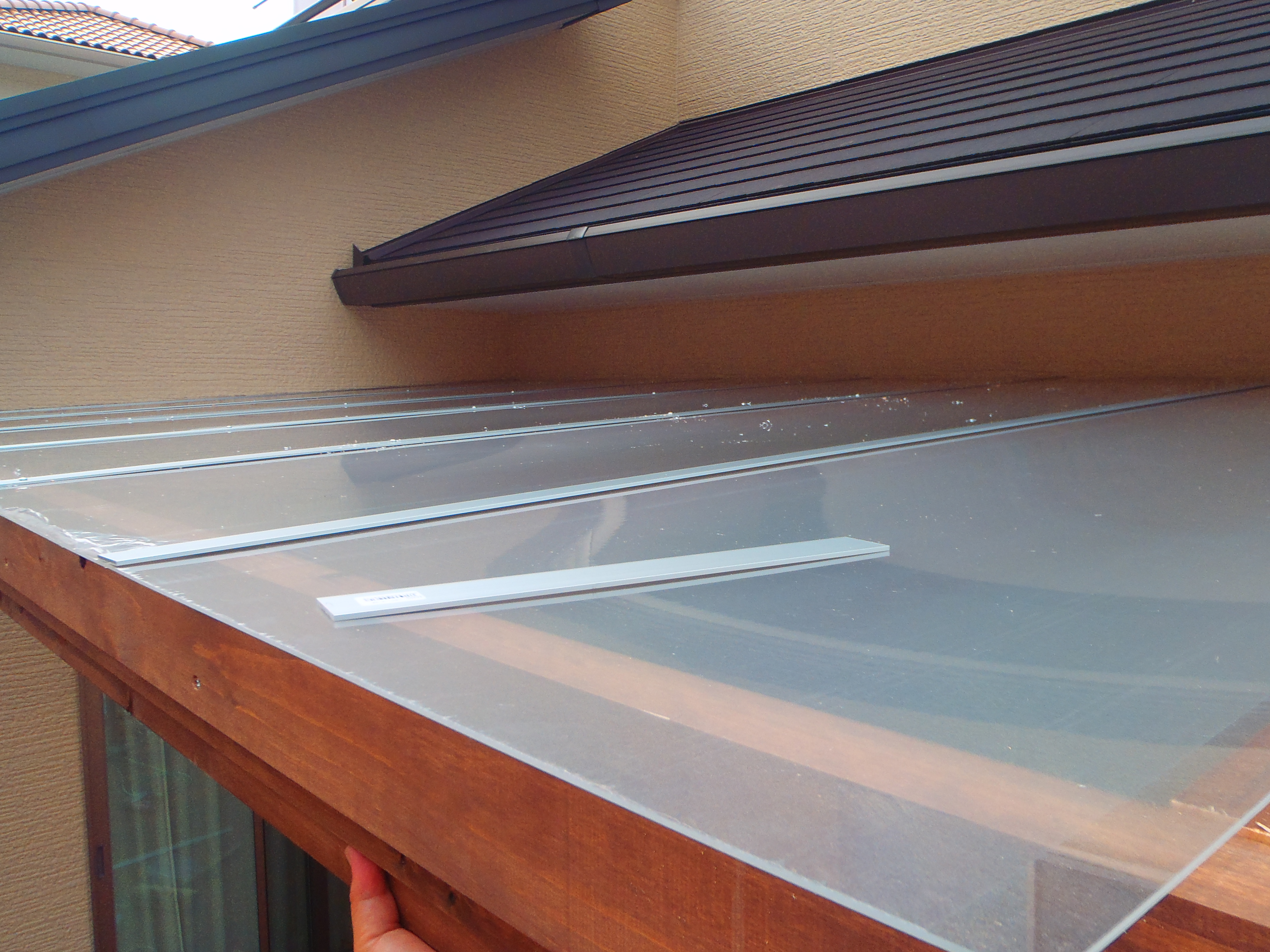 ポリカ屋根は三協アルミのカーポート既製品を注文し、半分にカットし、