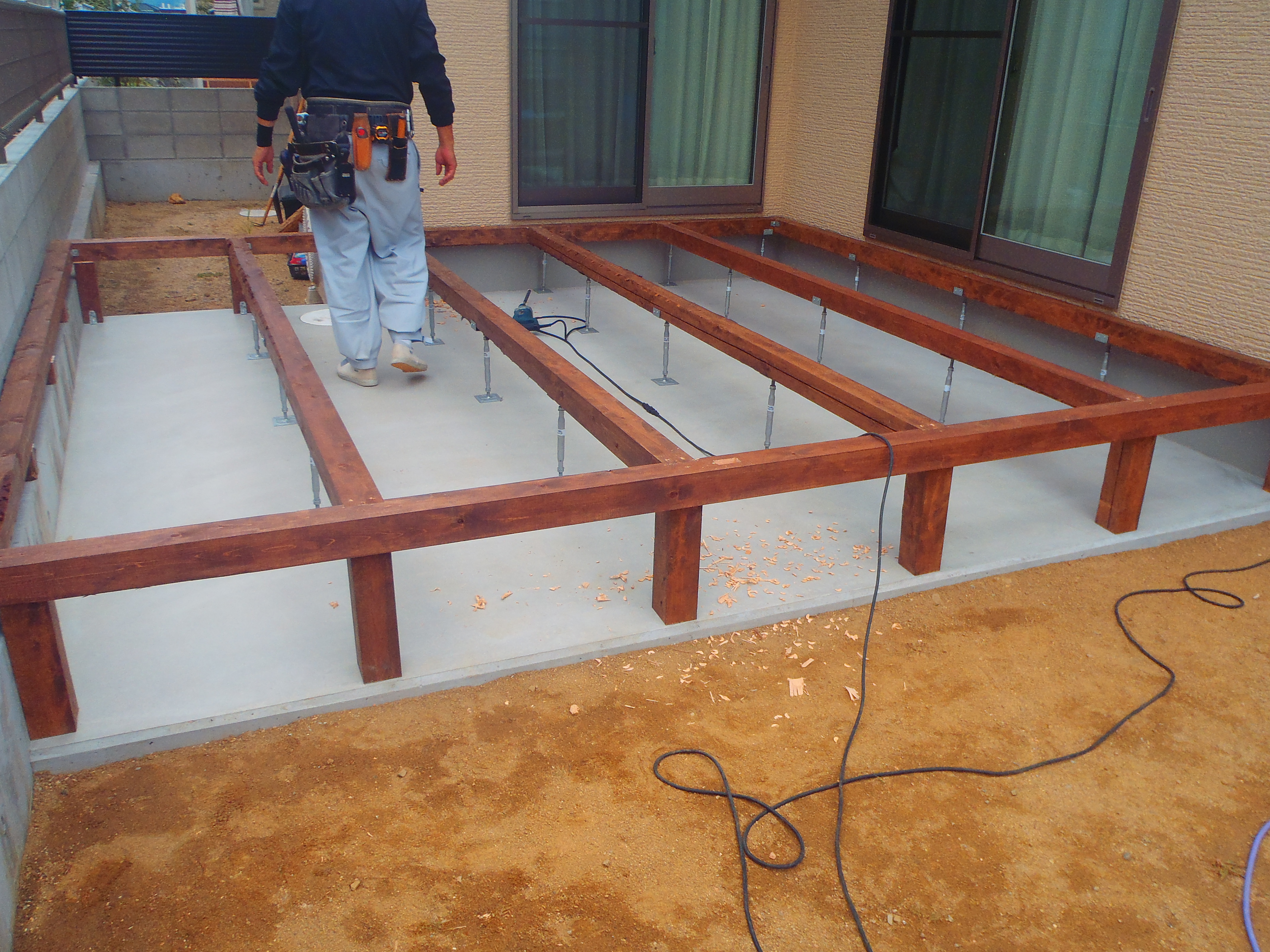 木工事2日目の高松市鶴市町外構・エクステリア工事は土台敷きに手間