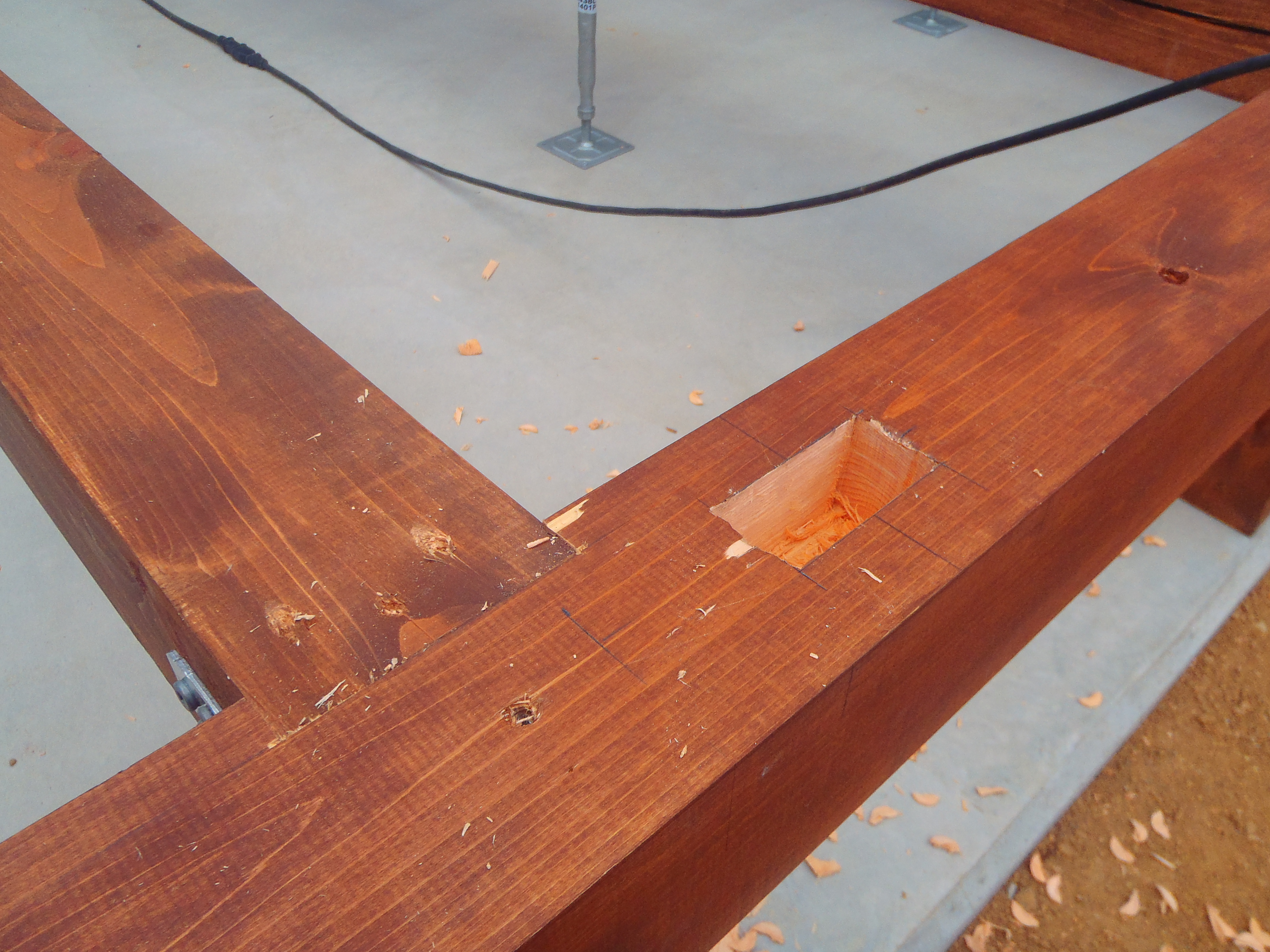 見た目と土間までカベ材を張り付けるため、ヒノキで束を建てております。