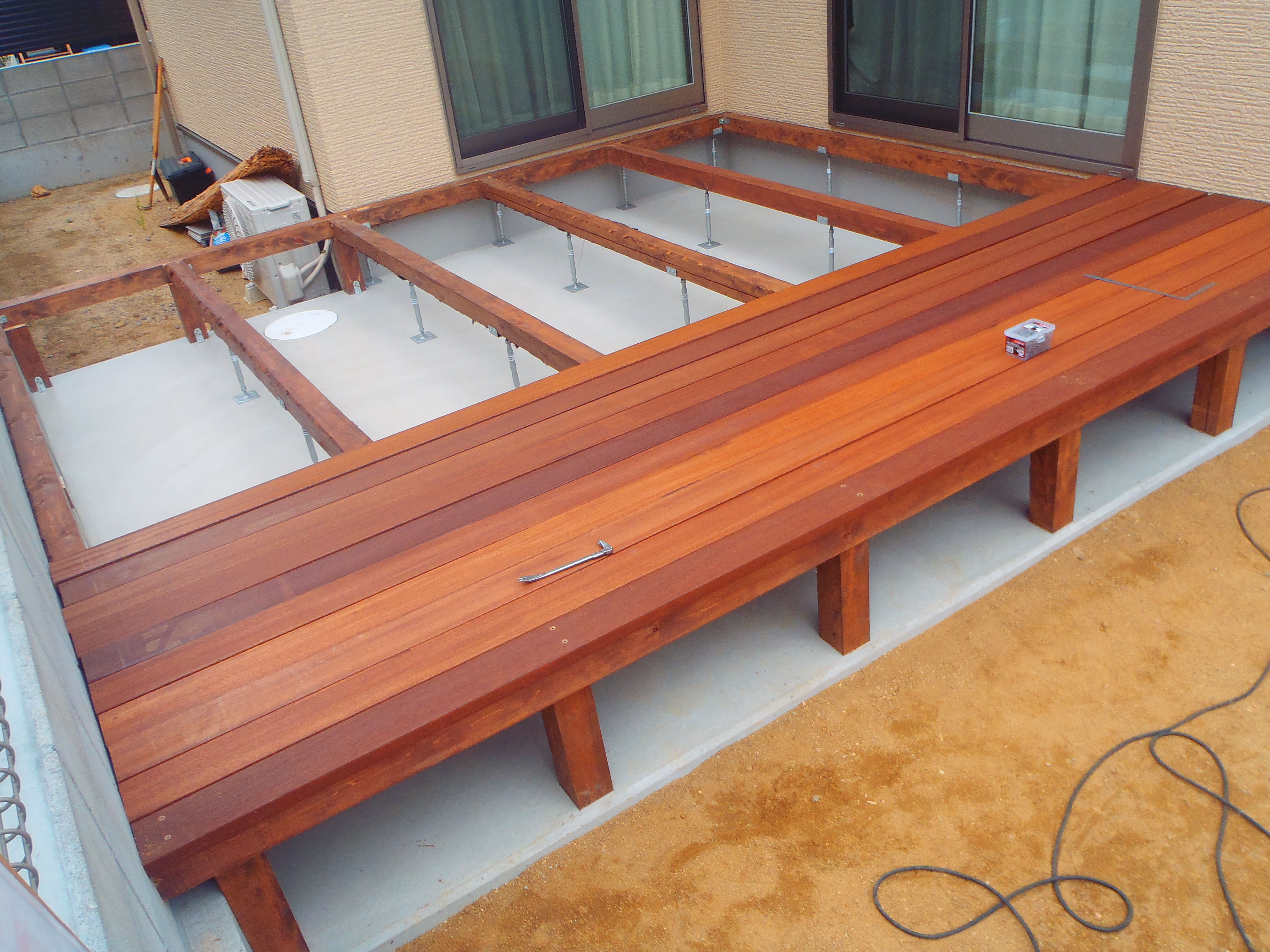 をかけ、ようやくデッキ材のセランガンバツ材を張り始めるところです。