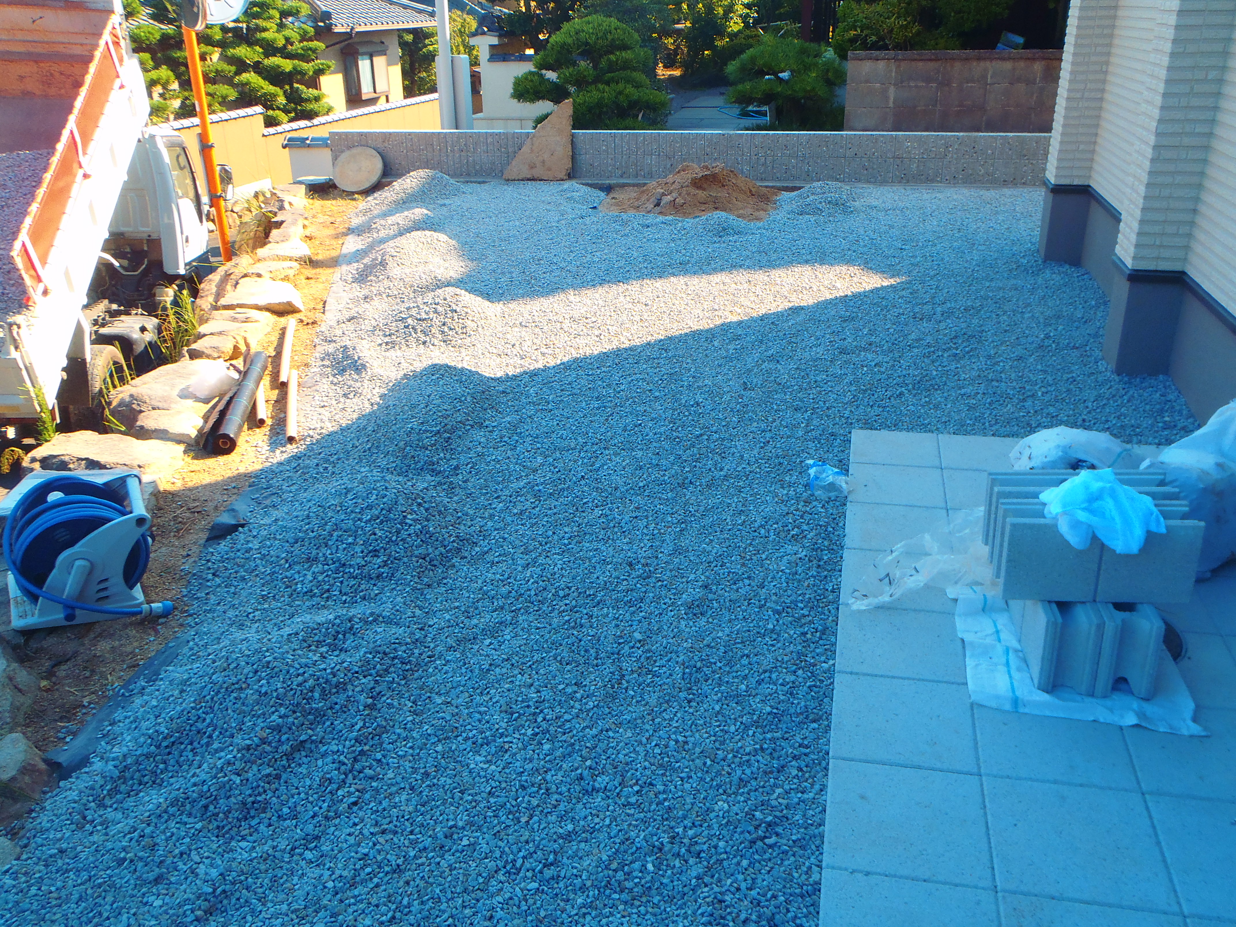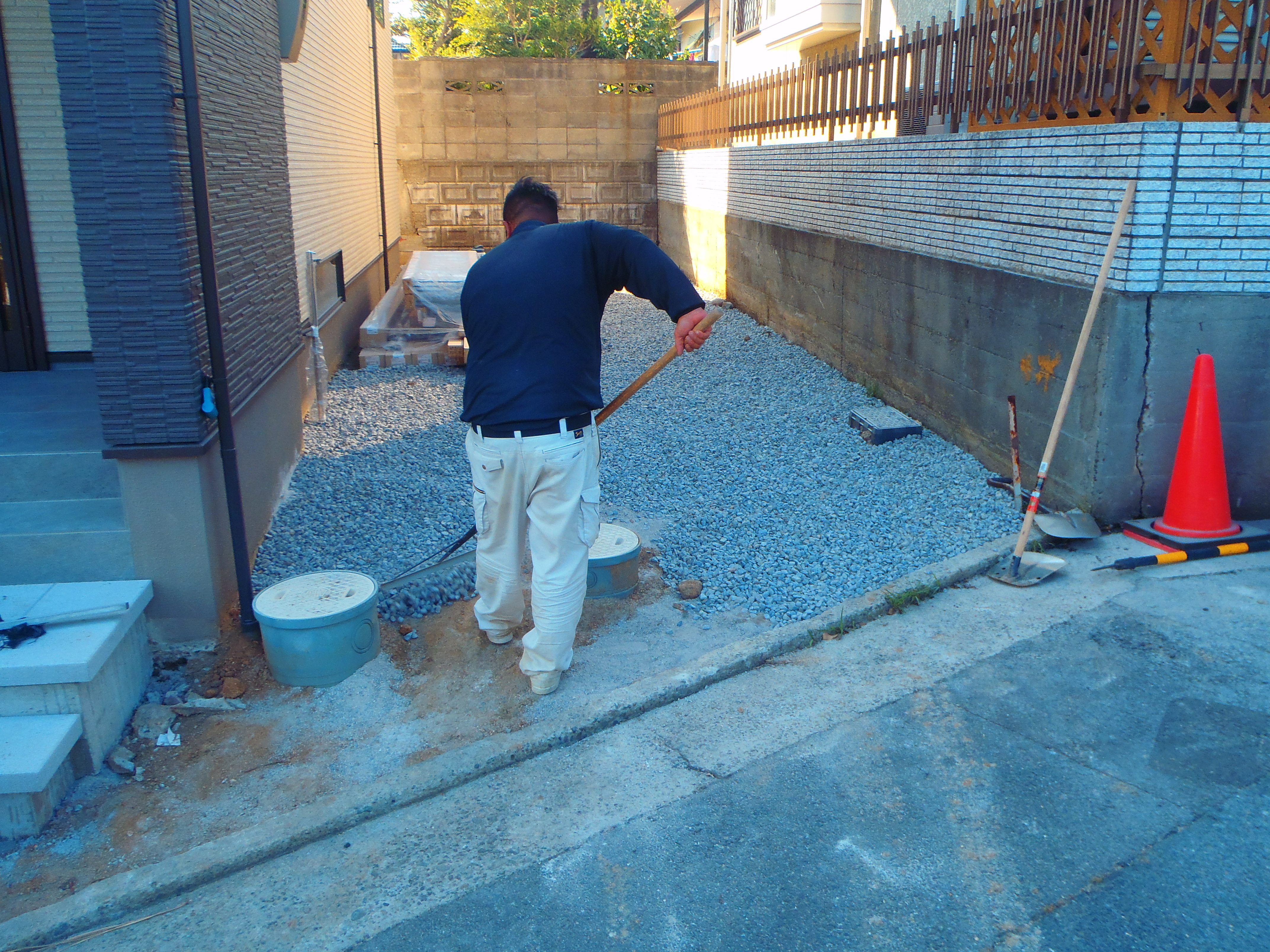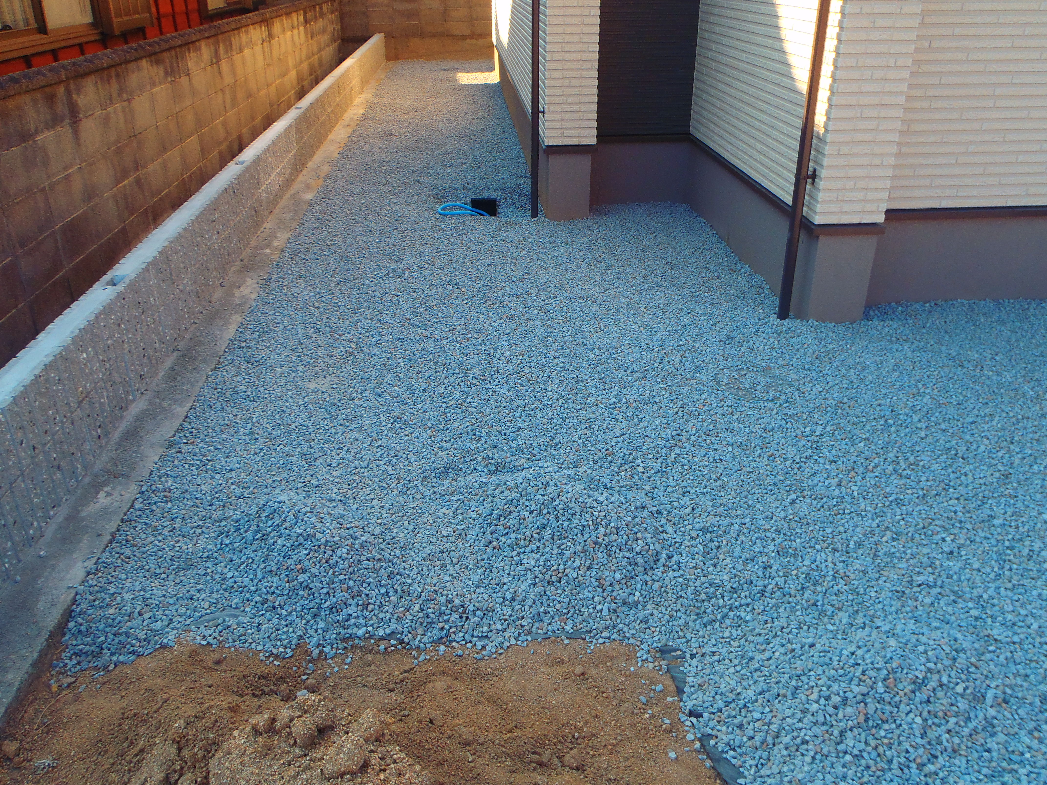 このところ防草対策が弊社では要望が高いので防草シートを先に敷いての砂利敷きです。