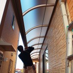 ◎エクステリア工事 三協アルミテラス:メニーウェルR型4.5間*3尺の柱建てを一旦 した後、土間コンクリートの流しこみの様子です。 コンクリートの乾き具合次第を待ちながら前面スク…