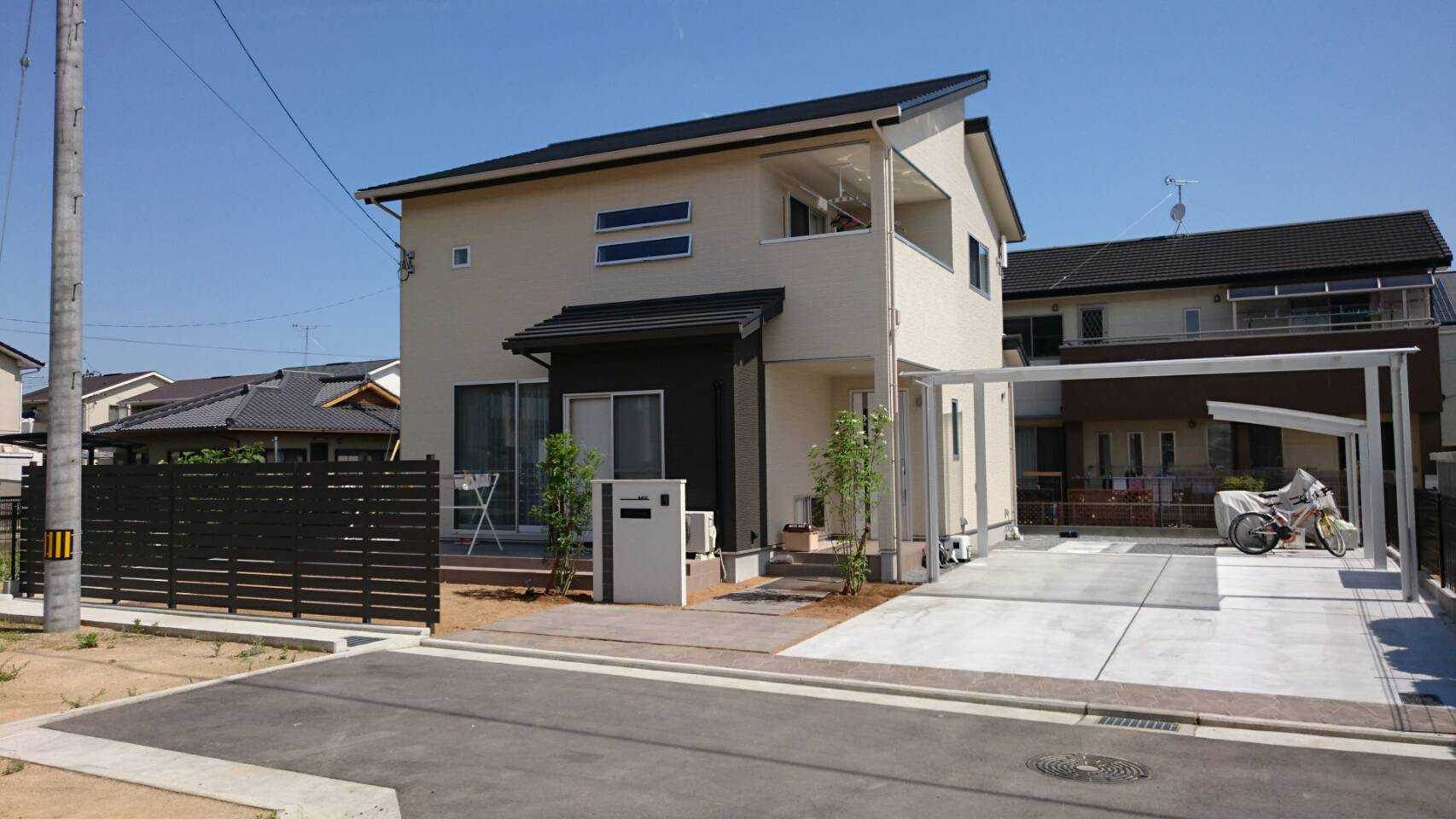 本日、香川県高松市出作町 K様邸外構工事が完了しました♪ 外観はこげ茶と白のツートン色でしたので、外構工事もツートンで仕上げました。 門壁前にTOYO プラーガペイブ 300*600 カラーは…