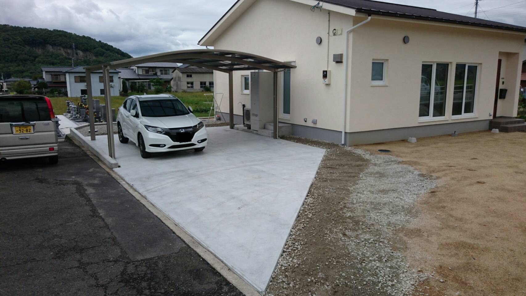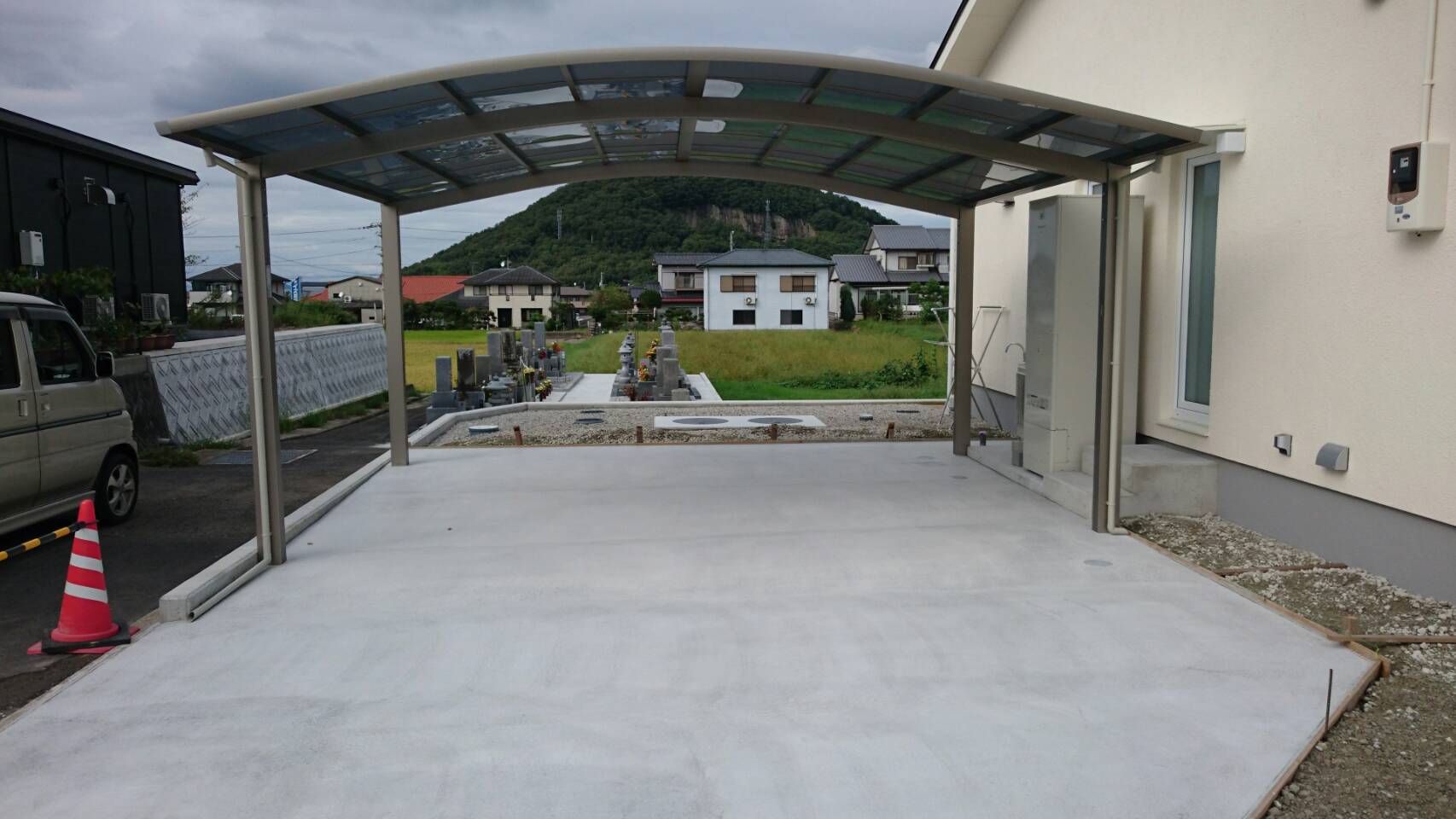 本日2度目登場の松原ですよ(*^_^*) 香川県高松市三谷町 M様邸の現場です☆彡 土間コンクリートも乾いてきました\(^o^)/ 三協アルミのカムフィエース ワイドのカーポートの屋根パネルは 熱線遮断ポリカを使用してお…