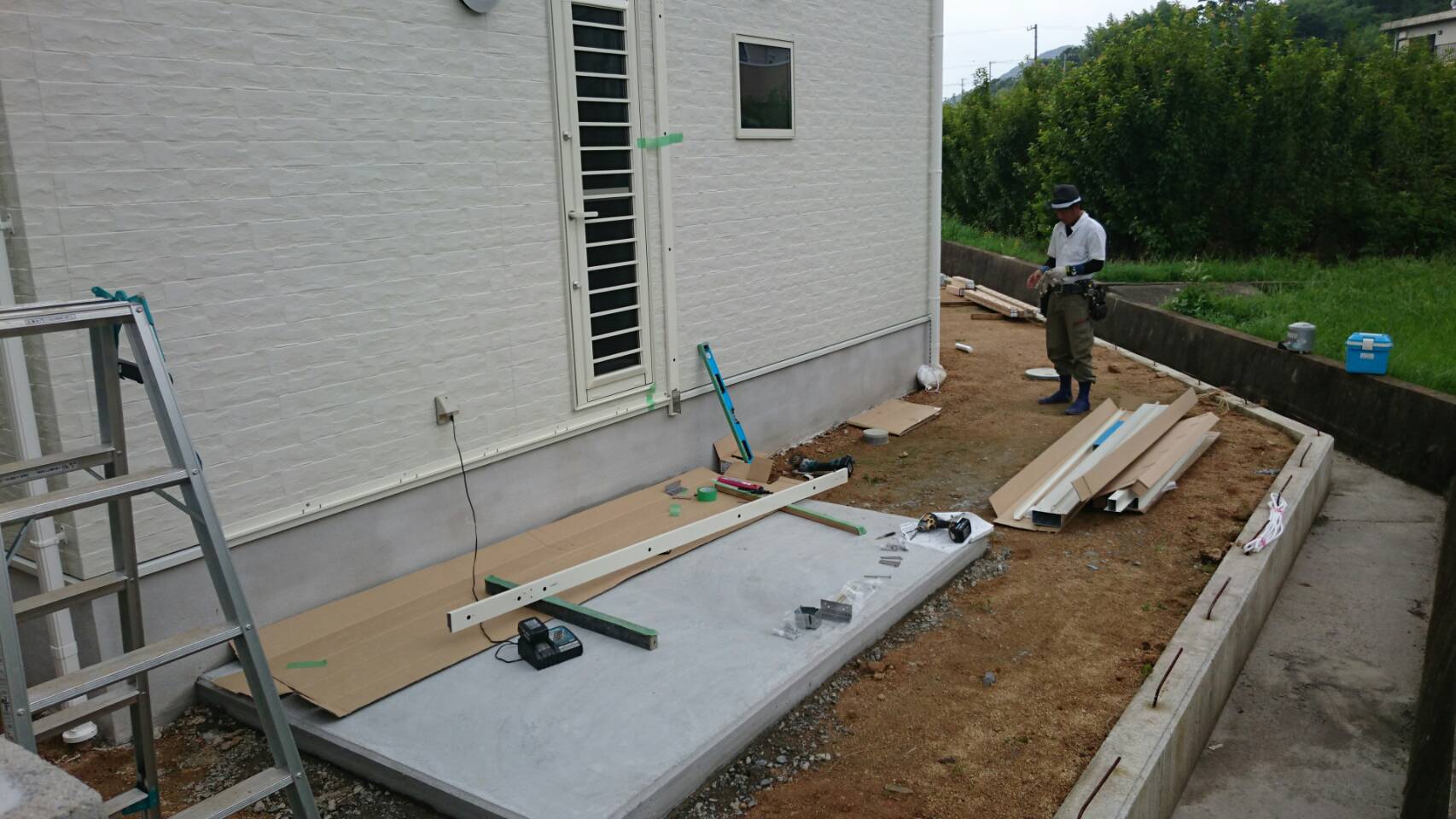 本日2回目の松原です\(^o^)/ 香川県高松市国分寺町 M様邸の現場からです(^^)/ サンルームの土間コンクリートも無事に乾きましたよ(^^) お茶目なアルミ職人の久保さんが現場に入って作業をしてくれて…
