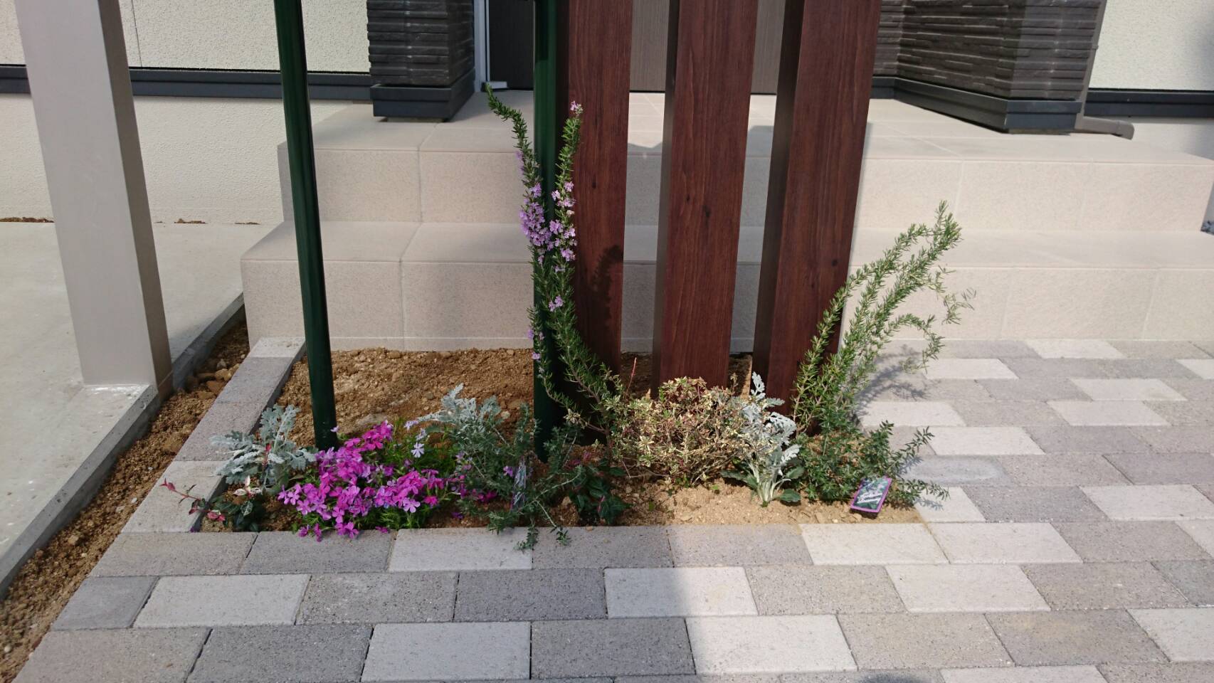 また登場の松原です(^^)/ 香川県高松市六条町 M様邸 外構工事途中経過になります♪ M様邸はもうお引渡しまでもう目の前です!!! 完工前の仕上げの段階にきておりますよ☆ 機能門柱の足元には植栽さん達を植…