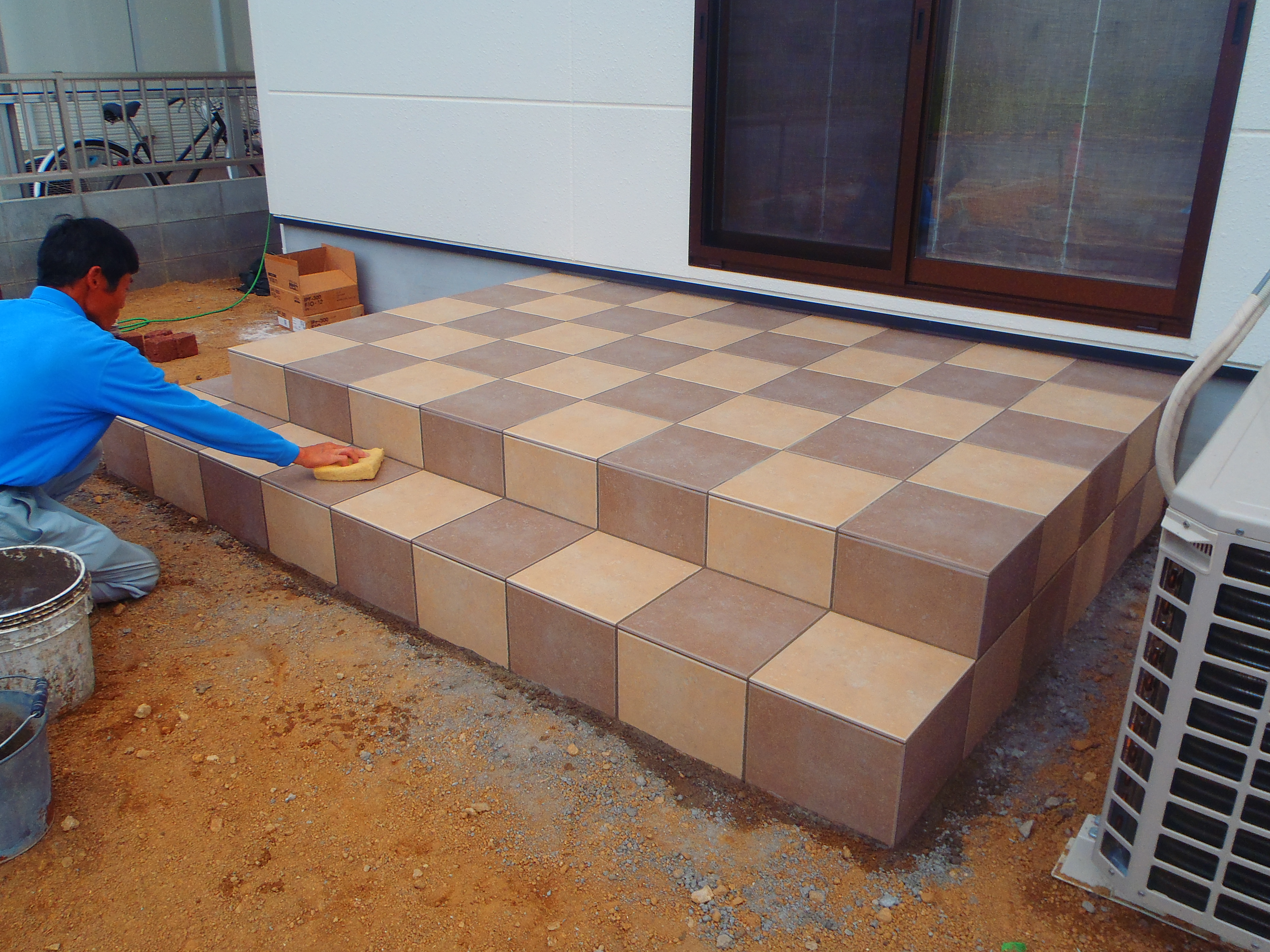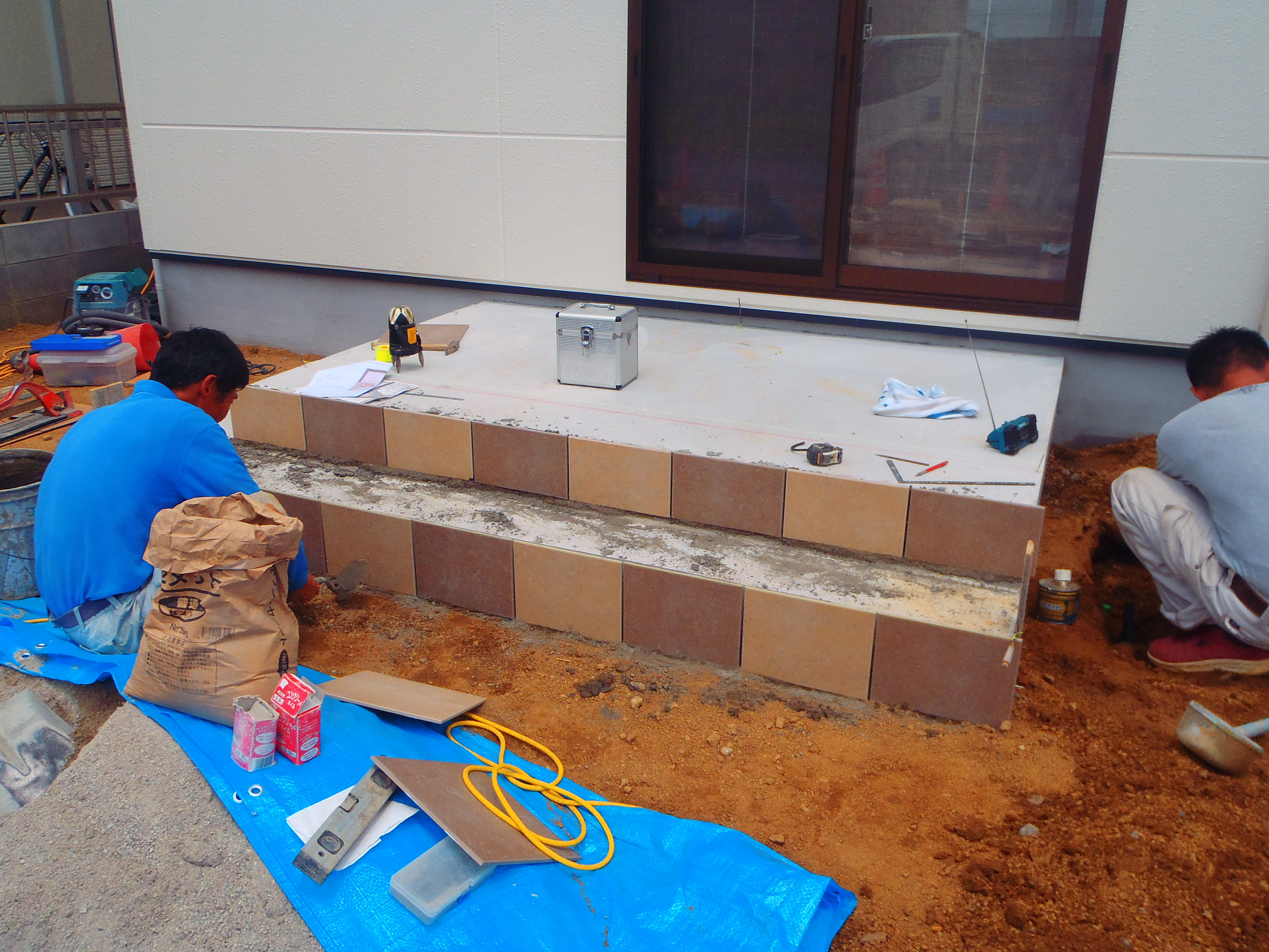 今日も汗だくになりながら、タイルを仕上げて頂きました。 ツートン仕様のタイルデッキが完全に形になって参りました♪ 今回ツートン仕様にした理由は、お施主様がそもそも下記にあります タイルのベージュ色を玄関タイルに仕様して…