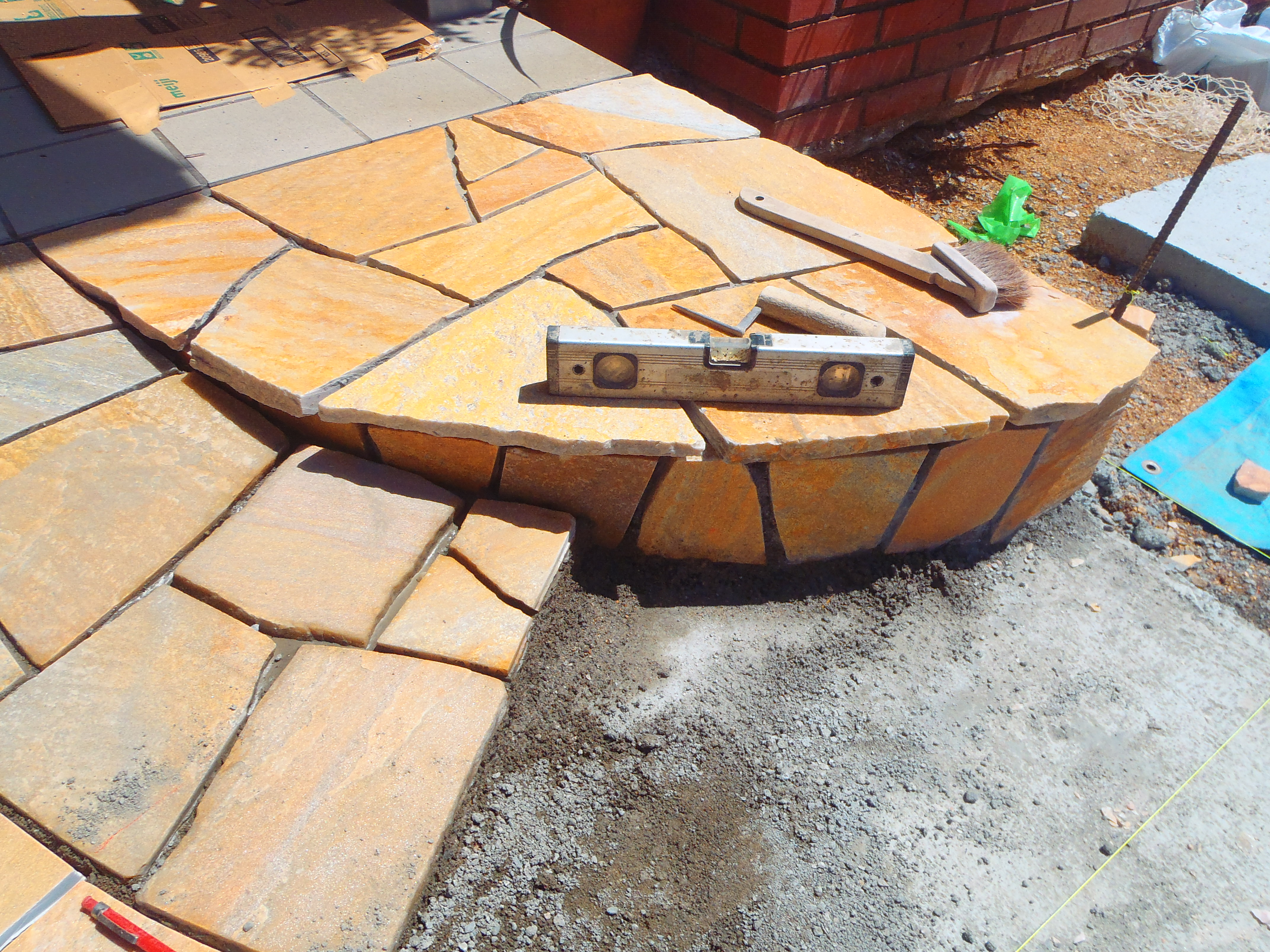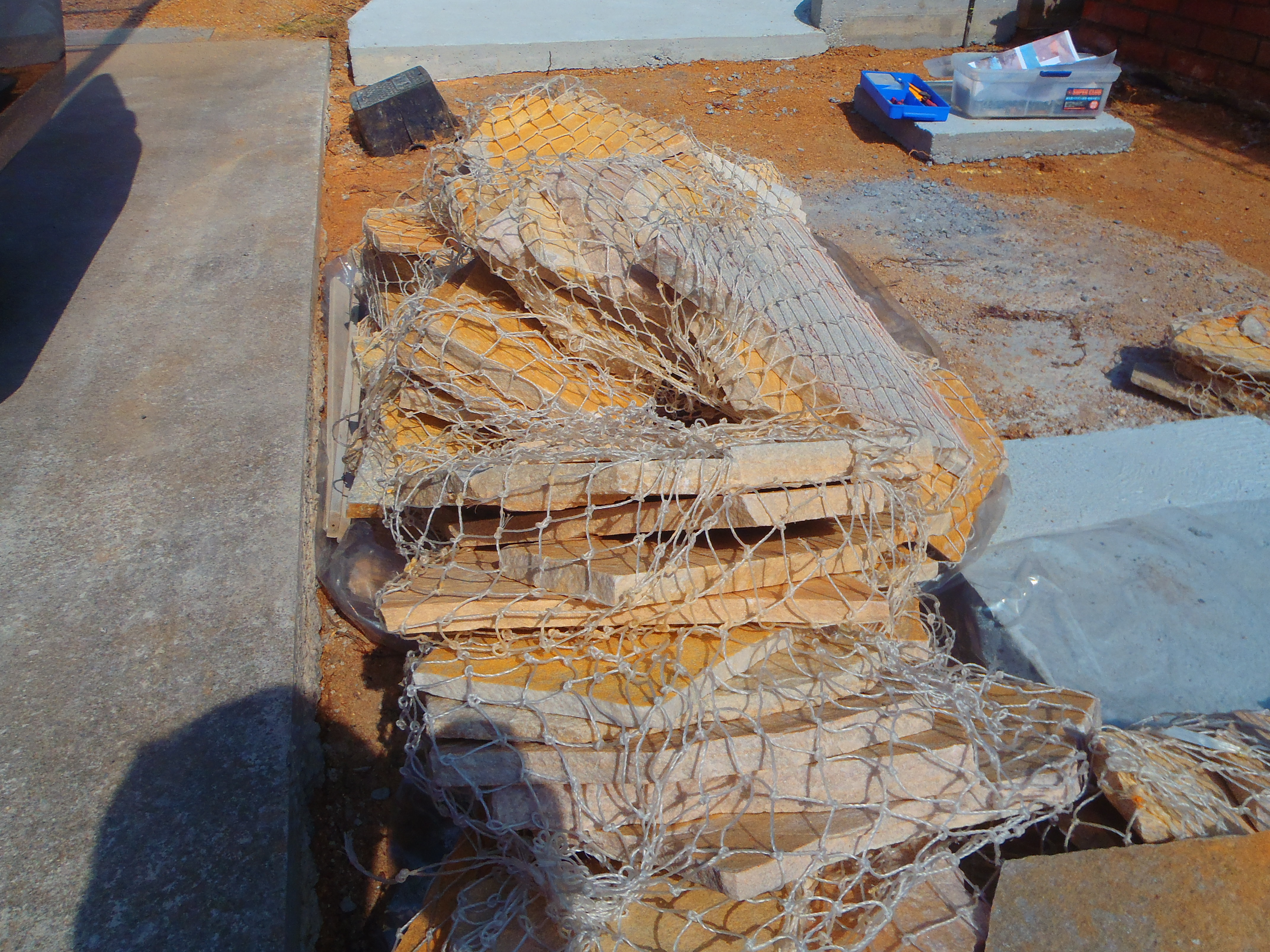 高松市松縄町では雨が降る前に少しでも進めるべく、石張り工事とレンガ工事に掛かっていきます。 この写真の青いシャツの男性はタイル職人さんです。 「小西さん」です。 非常に丁寧でお客様からのクレームはないし、現場は綺麗に維持…