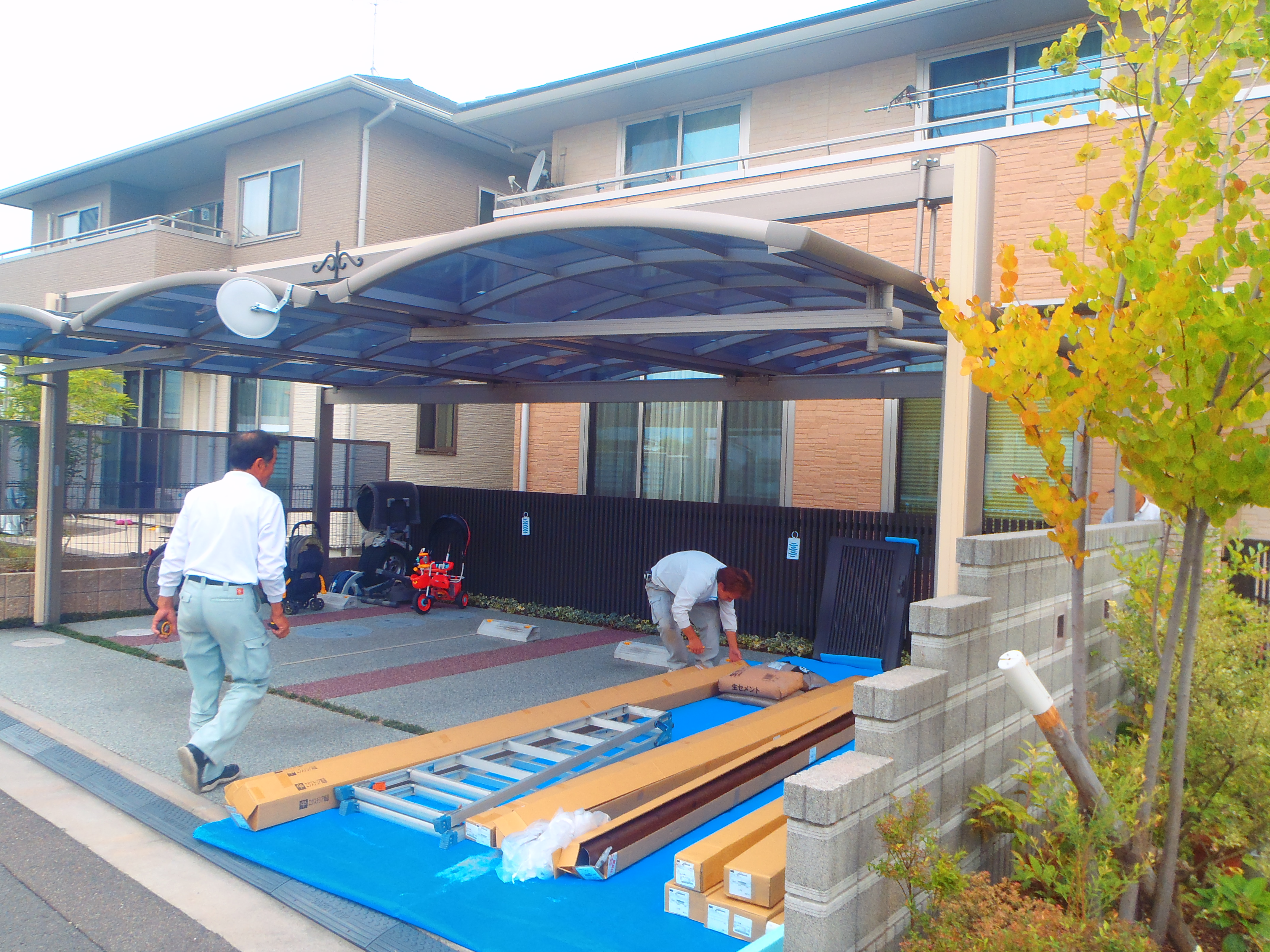 ◎エクステリア工事完了(香川県高松市西山崎町) 三協アルミ「ナチュレ」 カラー/トラッドパイン・間口4間×出幅3尺・ポリカーボネイト/クリアマット I様とワンショット♪(ブログ掲載許可をもらっております) …