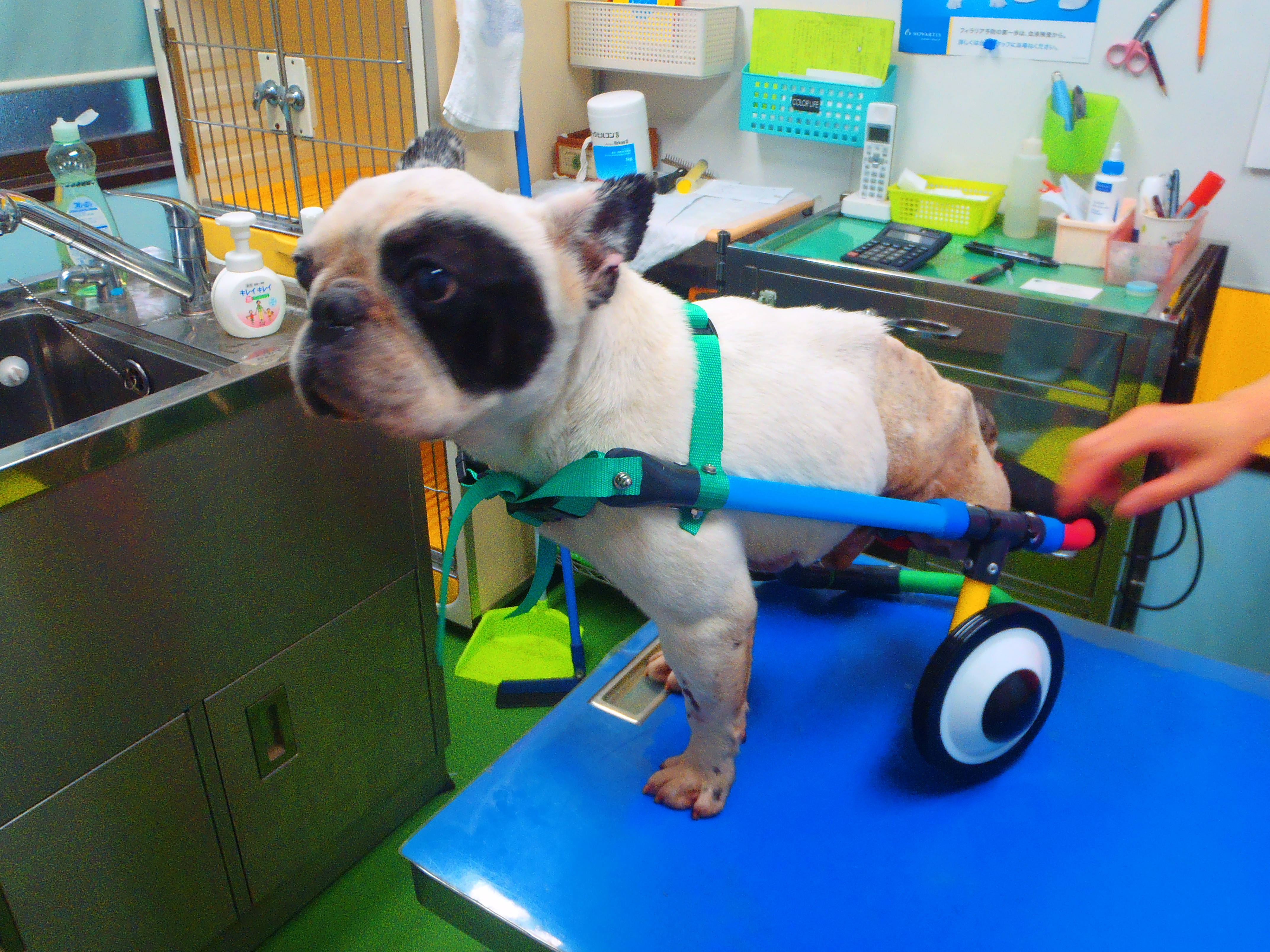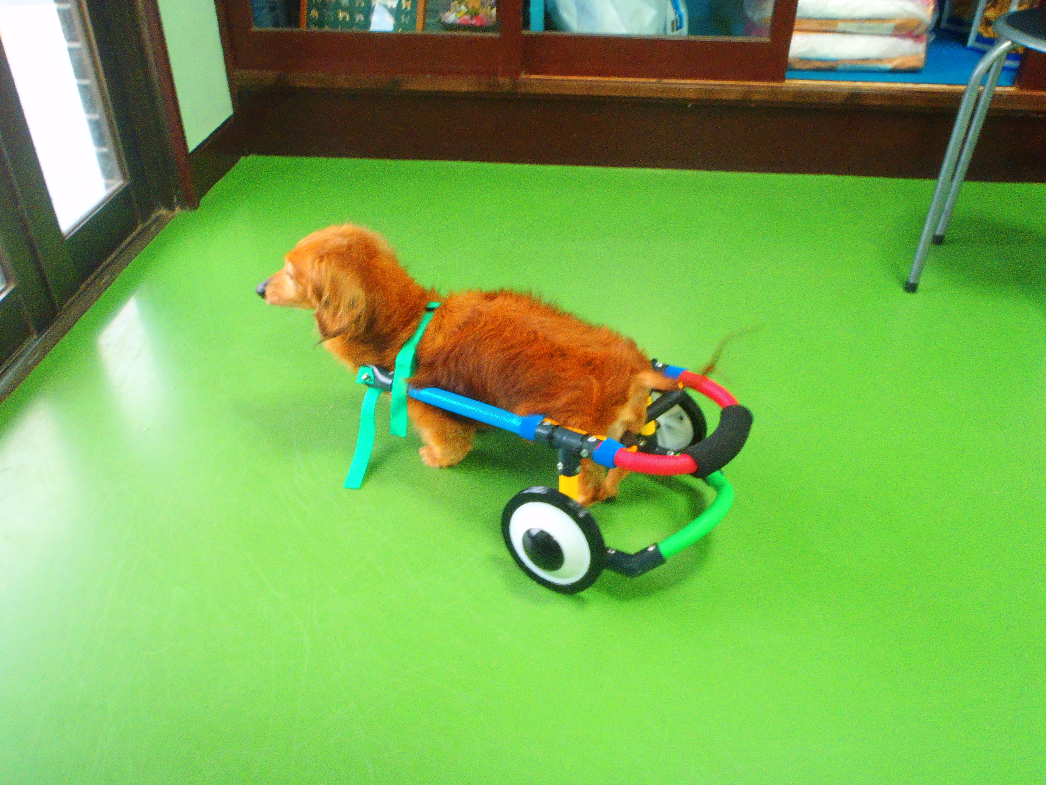先日車椅子試作品の車イスを持って善通寺犬猫病院に行き、先生方にアドバイスをもらってきました。 ちょうどヘルニアで腰を手術したミニチュアダックス君がいて乗せてくれました。 サンプル車椅子のサイズはこの子には合っていませんが…